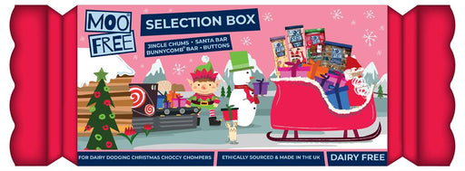 A range of Moo Free products featuring Mini Bar Bunnycomb, Milk Choc Buttons, Santa Bar with cereal balls and Jingle Chum